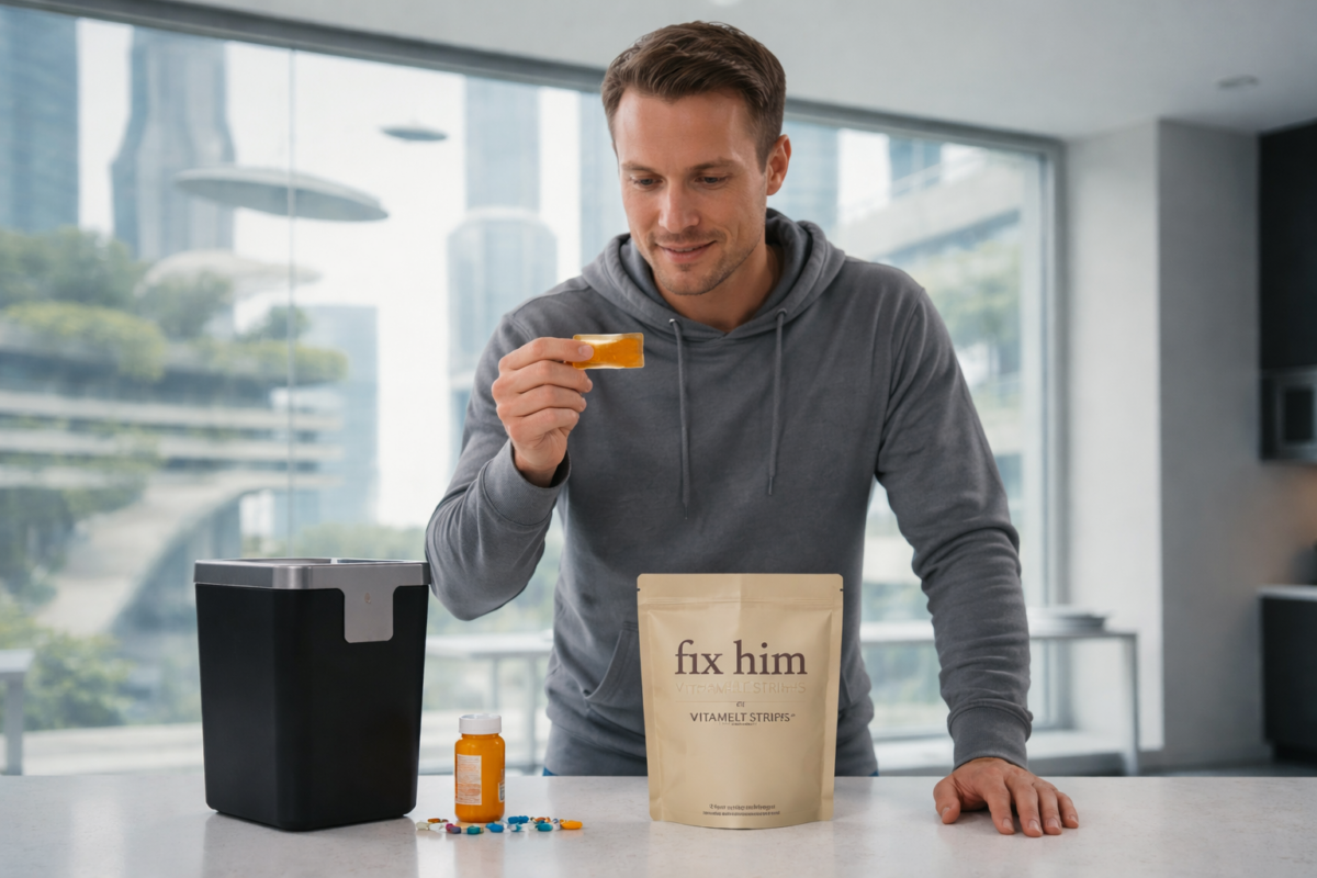 Their Fix Him™ strips combine advanced oral-film delivery technology with a clean, potent blend of herbs including Ginseng, Goji Berry, and Cordyceps. Each strip dissolves completely on your tongue with no water, no chewing, and no fuss.